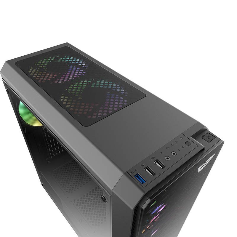 Enjoy simple and convenient operation of your computer. The case is equipped with 2 USB 2.0 ports and one USB 3.0 port, which will allow you to transfer files quickly. The product also has a built-in power button and sockets for connecting a microphone and headphones. What’s more, one of the ports supports RGB lighting effects control mode.